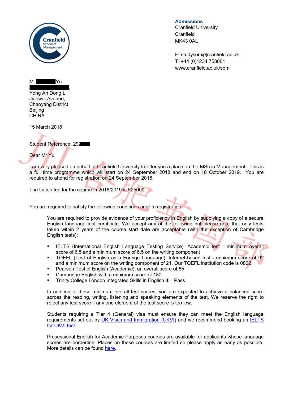 录取院校:克兰菲尔德大学 曼彻斯特大学 诺丁汉大学 录取专业:管理学