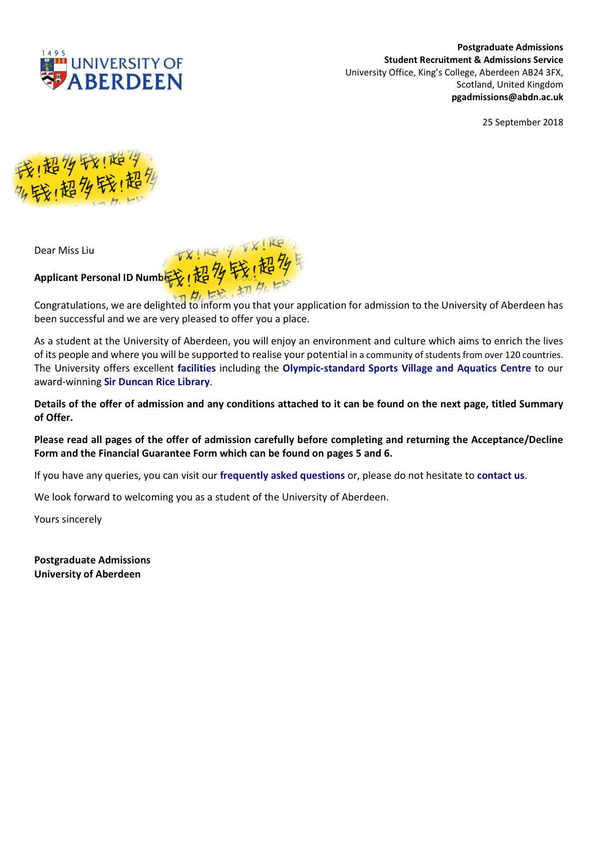 学生找到我们的时候表现出极强的留学意愿,由于已经有职场经验,希望早出国早深造,回来有更好的职业发展。所以针对该学生我们制定了详细的学习计划和申请规划。由于申请时间较早,学生很顺利的拿到了阿伯丁的offer。