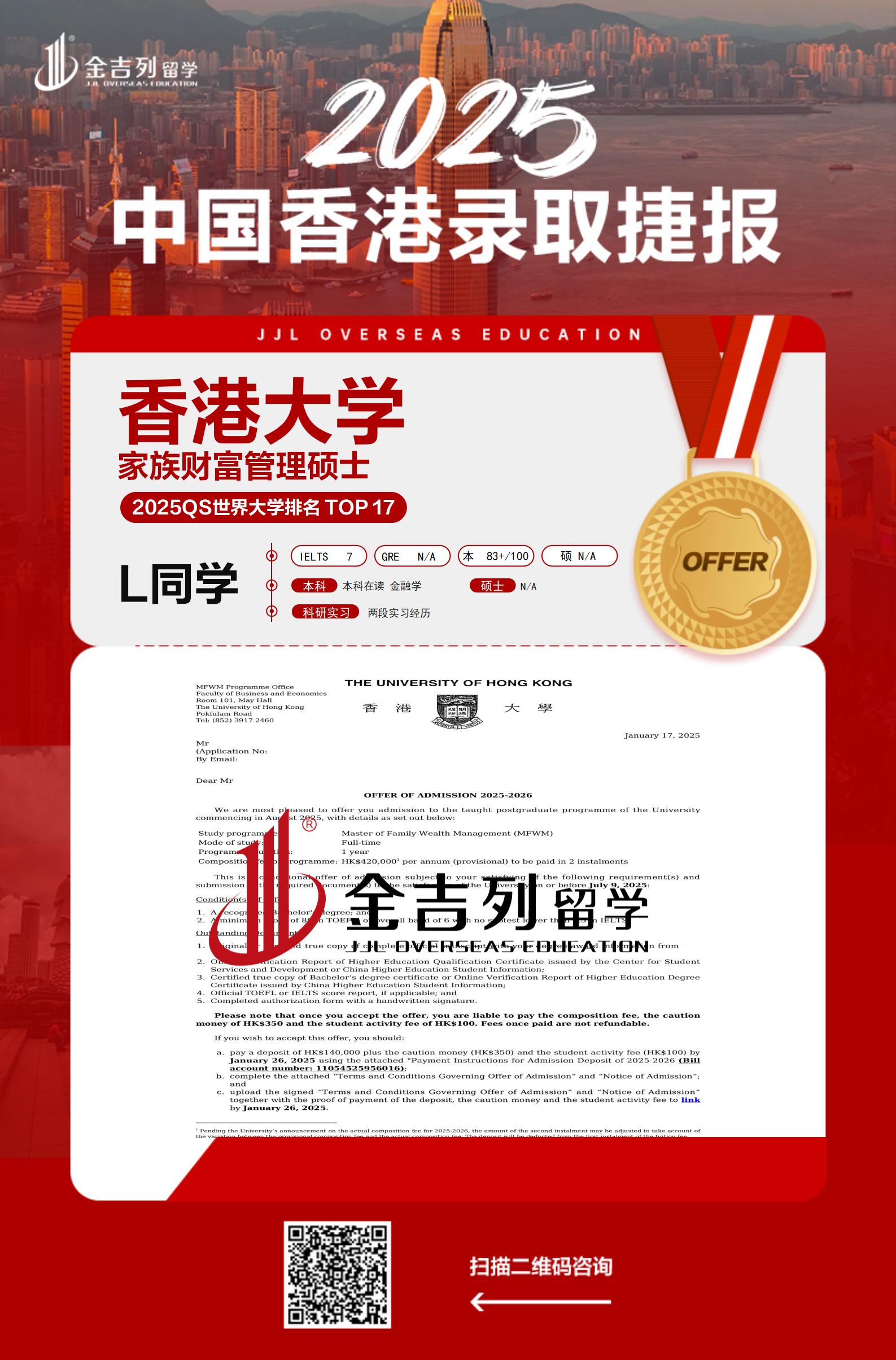 恭喜小L同学喜提QS17位的香港大学家族财富管理专业录取
