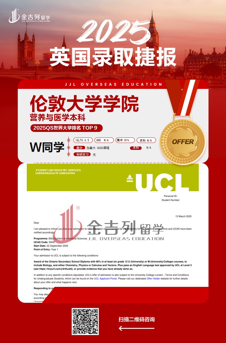 > 恭喜W同学被英国伦敦大学学院本科录取