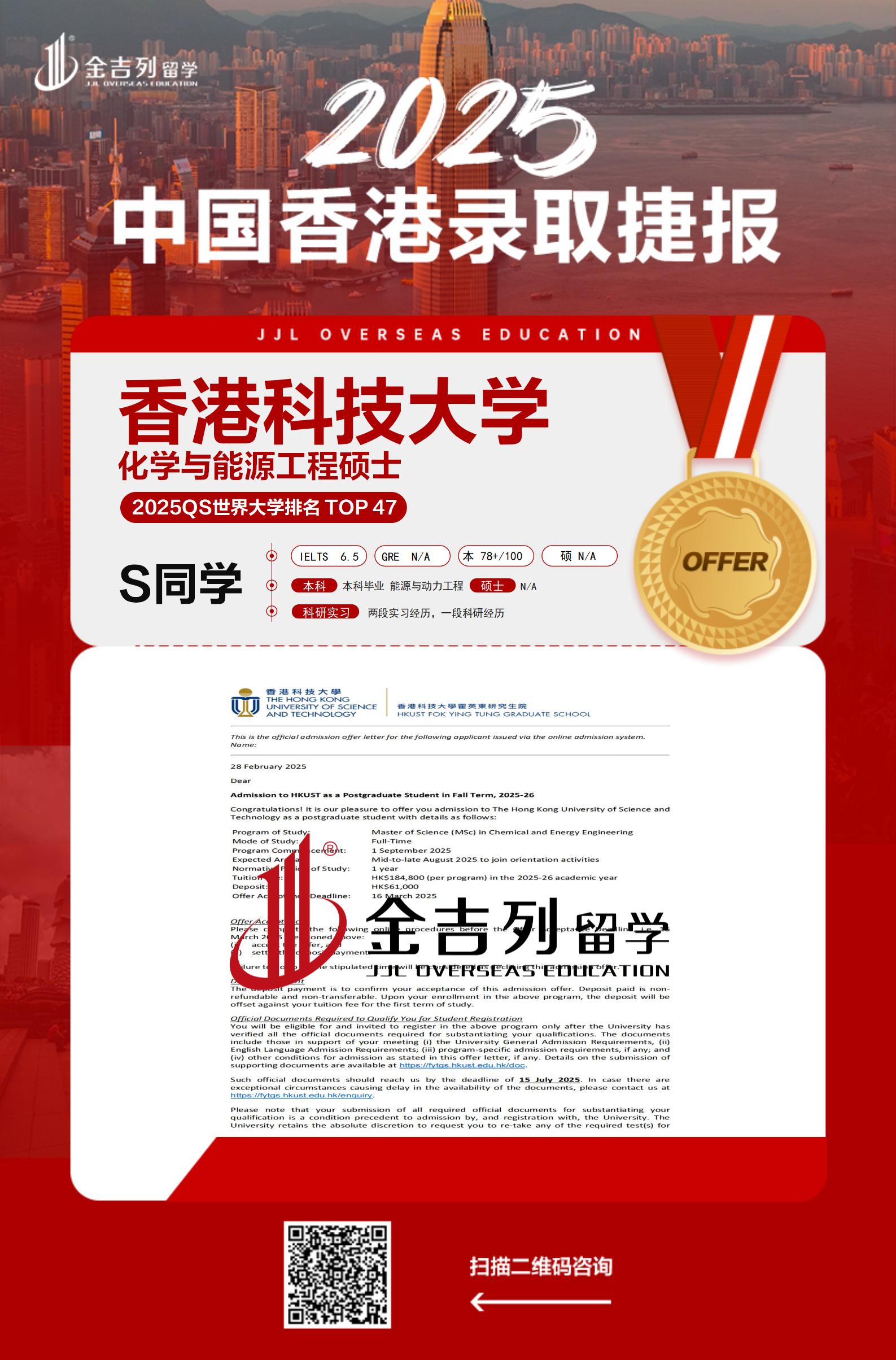 恭喜S同学被香港科技大学化学与能源工程硕士录取