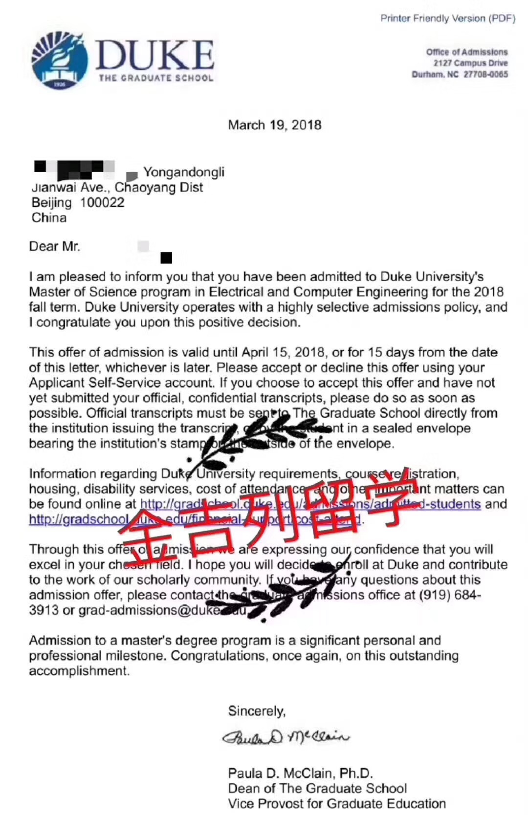 该学生的本科院校背景以及初始GPA都没有优势。在大一时想转专业但是未果。来找到我的时候对前途比较迷茫。在面谈4次之后,他逐渐认识到自己专业的优势及就业前景,和出国深造后的优势。众所周知,电子与计算机工程专业在美国是十分热门的,就业前景广阔,涉及行业众多。该同学在确立了目标之后便果断签约。在合理的安排规划下,学生在GPA,TOEFL,GRE和活动科研背景上都占有显著优势,并配合我们进行了三次的文书修改定稿,最终得以被全美排名第9的杜克大学ECE专业录取。