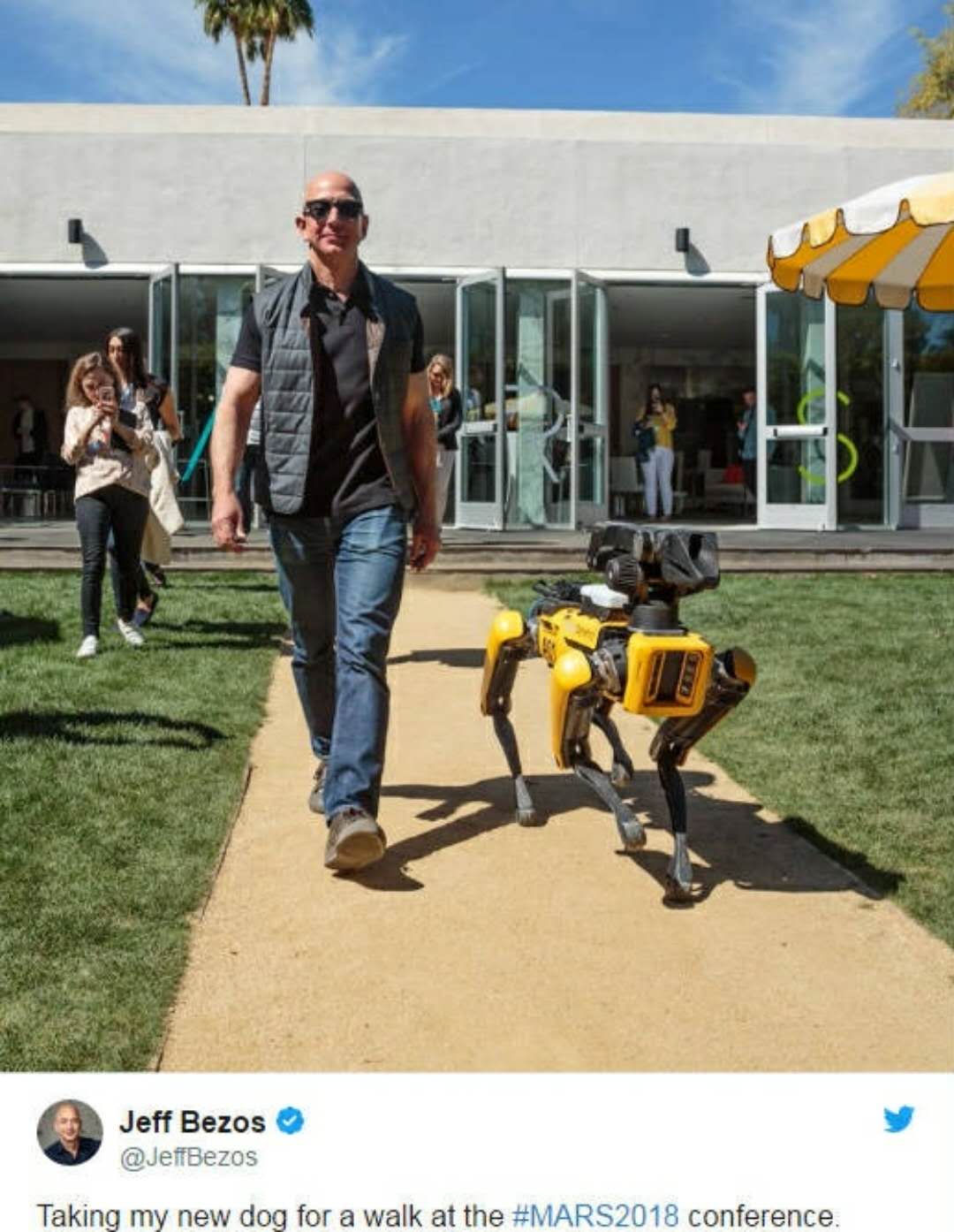 亚马逊创始人Jeff Bezos的Twitter照片,他与波士顿动力开发的机器狗正在散步。酷!