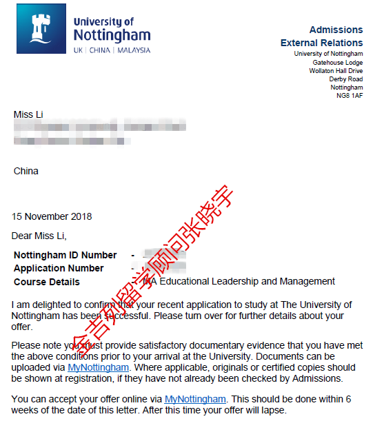 录取结果 :诺丁汉大学