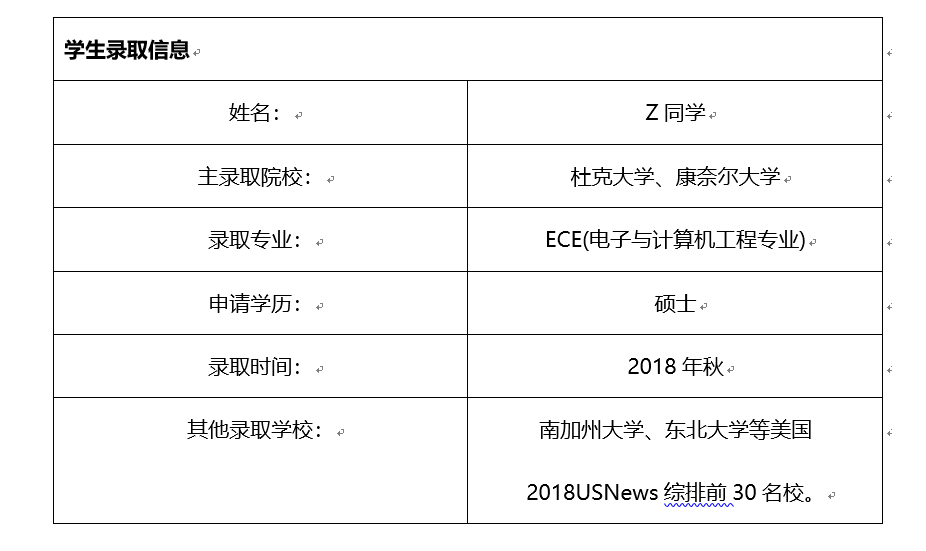 金吉列留学美国部团队全部由资深顾问担当, 1+8 的咨询团队,专注美国留学,从考试规划,背景提升,职业规划方面为每一个学生设计最具发展的留学规划。因为 Z 同学的整体情况还不错,我和学生觉得冲刺名校是有机会的,于是综合了学校环境、学校排名,专业排名和地理位置等因素,制定了有梯度的选校方案,挑选了杜克大学、康奈尔大学、莱斯大学、康奈尔大学、卡耐基梅隆大学、密歇根大学安娜堡分校、加州大学圣地亚哥分校、普渡大学、俄亥俄州立大学。