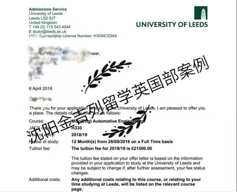 附上学生利兹大学的通知书~更多详情请咨询沈阳金吉列留学老师~