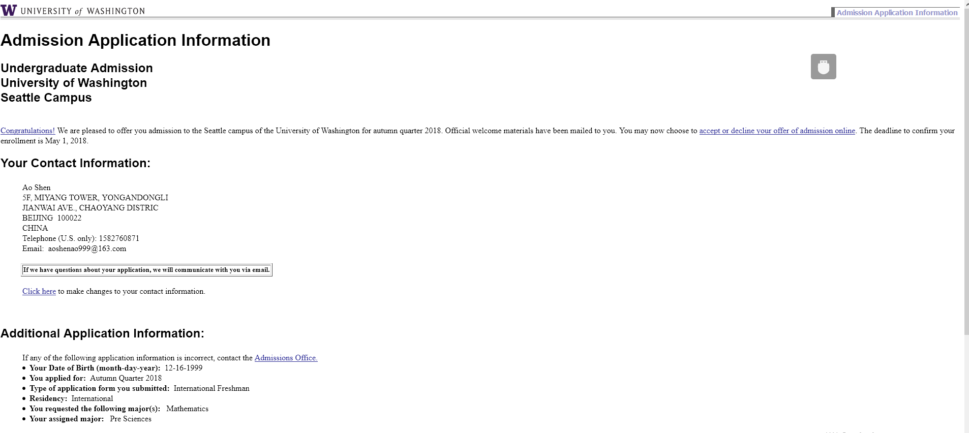 华盛顿大学录取offer!