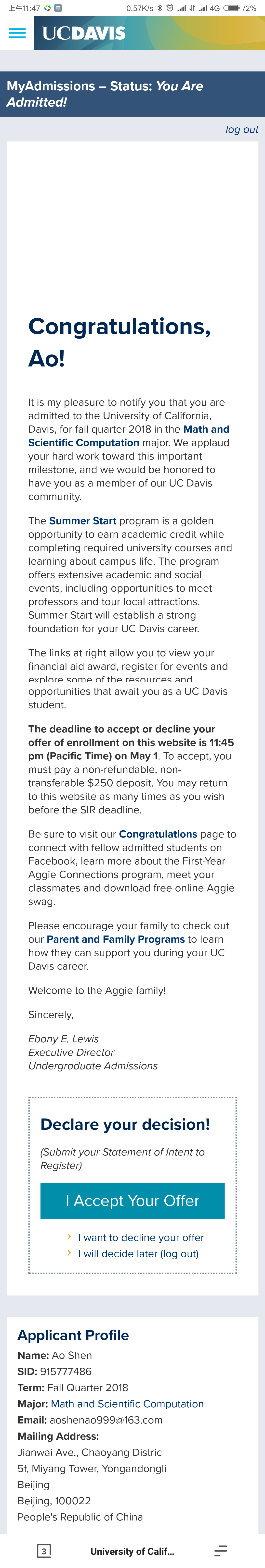 沈同学,申请本科,加州大学戴维斯分校Math an Scientific Computation录取!