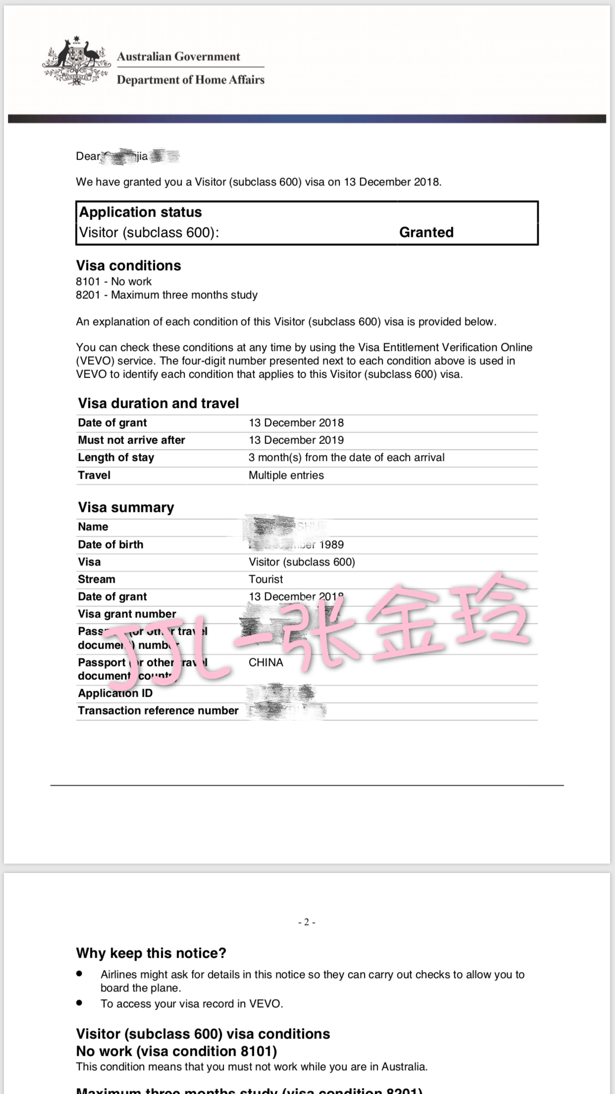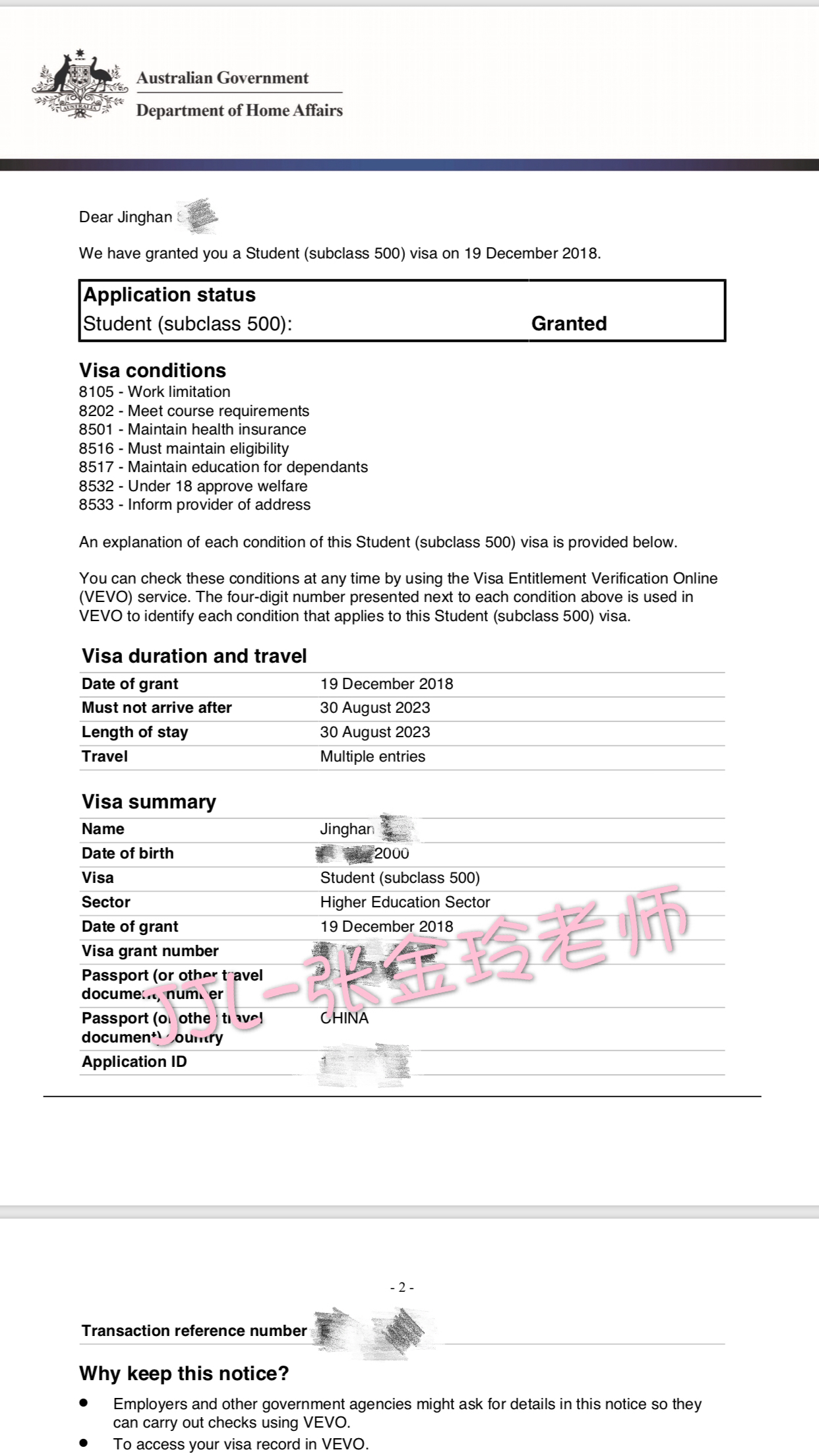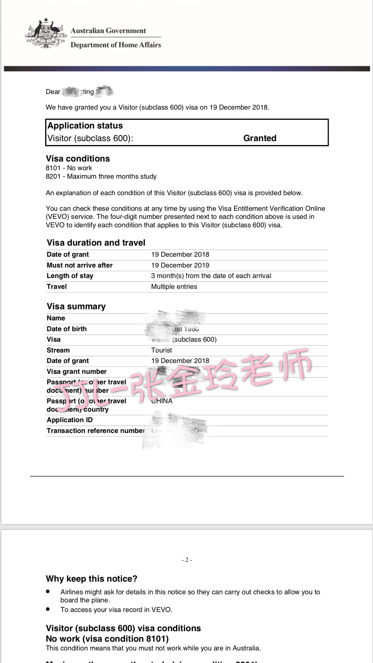 签证高峰期,金吉列学生火箭班速度下签,Jinghan宝宝的学生签证3个工作日无电调下签,两位姐姐送她开学,探亲旅游签证都在一周内无电调获签。安心买机票定酒店准备飞往澳洲