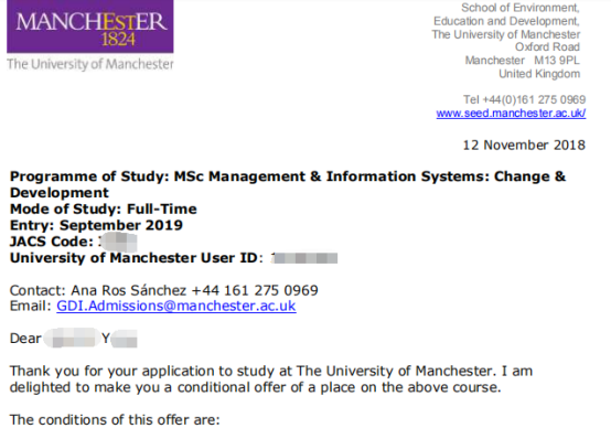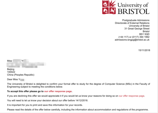 录取详情:10月16-11月1日录取递出几所院校申请,11.13日曼彻斯特大学录取,11.13日同期布里斯托大学拒绝。经argue,布里斯托大学表示愿意重新考虑学生申请,11.19日布里斯托发来有条件offer。
