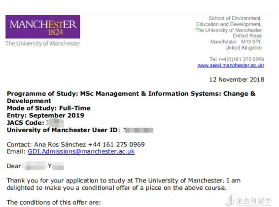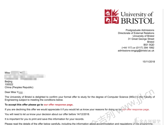 录取详情:10月16-11月1日录取递出几所院校申请,11.13日曼彻斯特大学录取,11.13日同期布里斯托大学拒绝。经argue,布里斯托大学表示愿意重新考虑学生申请,11.19日布里斯托发来有条件offer。