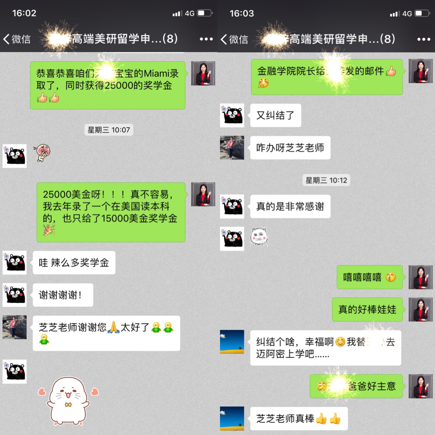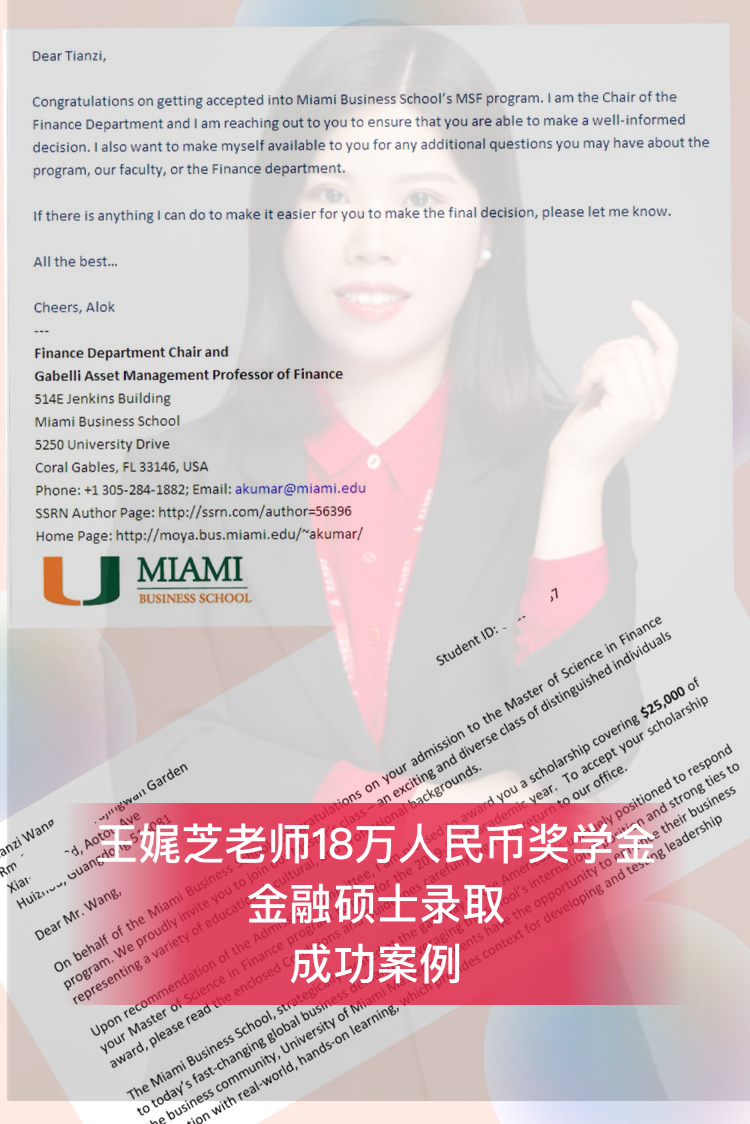 在等待的过程当中,Tianzi一家人都非常焦虑,王娓芝老师也多次通话沟通耐心抚慰家人的焦虑,终于在2019年1月16号,第二所申请院校迈阿密大学出结果,就收到了迈阿密大学录取,并且获得25000美金奖学金,学生和家长非常开心,继拿到自己第一所院校的录取之后,有拿到迈阿密大学的录取,并且获得25000美金丰厚的奖学金,期待后续拿到名校的录取通知书!四、offer展示