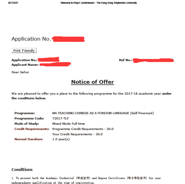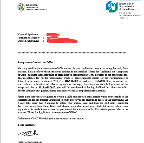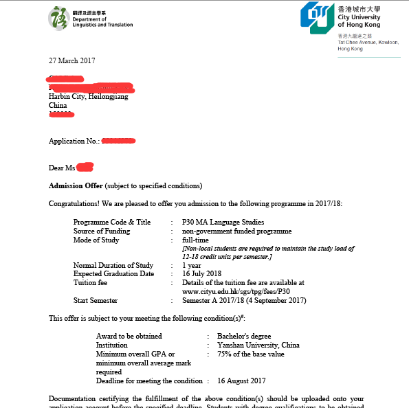录取结果:香港城市大学(世界排名第57位,全香港排名第4位)