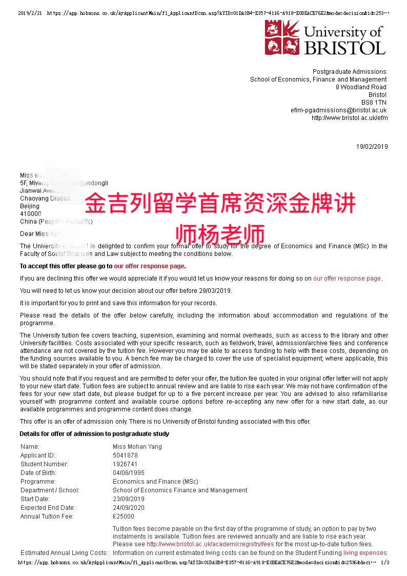 录取结果:布里斯托大学