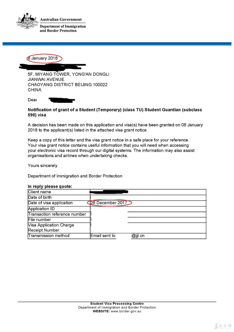 在紧跟孩子学校申请的同时,老师还和移民部同事详细沟通了以后可能会涉及到的材料以及时间节点问题,提前保证了材料的完整及一致性,虽然最后因为移民主申请人的年龄问题最终还是一起递交签证,但是由于前期的充足准备,在圣诞节当天递交签证之后, 7 天后无电话调查直接获签, 后期客户也成功的拿到了澳洲移民局关于移民的邀请函。