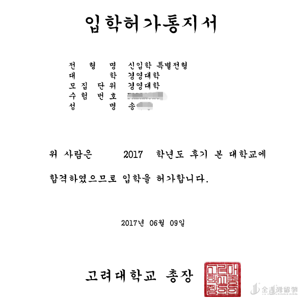 学生是 2017 年 6 月高中毕业,该生高二参加完所有会考科目并合格,决定申请韩国语学院以及本科。于 2016 年 6 月和公司签约,申请 2017 年 3 月的高丽大学语言以及 2017 年 9 月高丽大学的本科课程。签约后该生参加 2016 年 10 月的 TOPIK 考试,并且考出 TOPIK 四级成绩,为后期申请本科做了很好的铺垫。为了提高申请高丽大学本科的录取率,指导该生在去韩国读语学院前在国内参加了雅思考试,并且考出 6.0 的成绩,更加加大了学生申请本科的成功率,加上该生在韩国高丽大学读语学院,最终被高丽大学本科经营系录取。