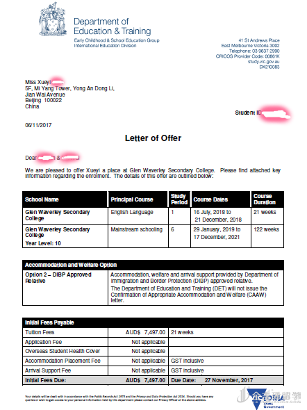 学生的叔叔在澳洲,已经获得 PR 身份,希望接侄女去澳洲读 10 年级,目前 9 年级在读。家长指定格兰威夫利中学,但是这所名校,是众多国际生和当地学生抢着去申请的学校,满位严重。家长在 2017 年 10 月 27 日中国时间下午 3 : 40 签约,已经错过了澳洲的工作时间,江老师加班在周五晚上周六周日 2 天多时间内,搜集材料,指导学生和家长准备材料。