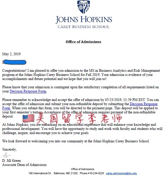 2019录取季第10份TOP30录取,约翰霍普金斯大学商业分析与风险管理MS in Business Analytics an Risk Management 专业录取。学生背景:中国人民大学,金融学,GPA2.98,托福102,GMAT680。