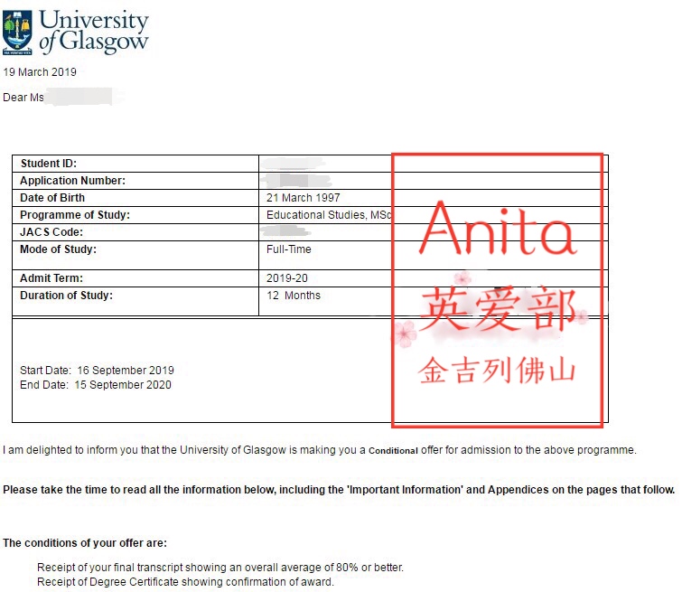 恭喜ZYF同学获得University of Glasgow(格拉斯哥大学)