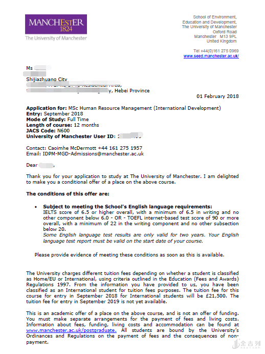 分析原因:曼大有商学院的HR 人力资源专业,但是对与双非背景申请,并没有任何的成功几率,但要知道,同样是曼大,国际发展学院中同样也有人力资源管理的专业,对于双非背景的学生,只要成绩在85分以上,把文书精准化的来写出来,就有很高的成功希望!