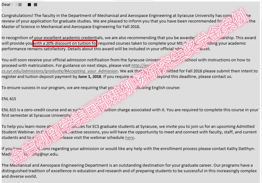 申请过程: 魏老师在跟XY同学沟通后,一边鼓励学生积极的考试,合理的规划了考分时间,另一方面,在选校方面综合整体的案例,根据往年经验选择对于语言要求比较宽松的学校,做到了合理的学校规划,同时文案老师和学生也进行了头脑风暴,突出学生的实践能力和想法,最终录取到美国前60的雪城大学录取,并且获得20%的学费减免。