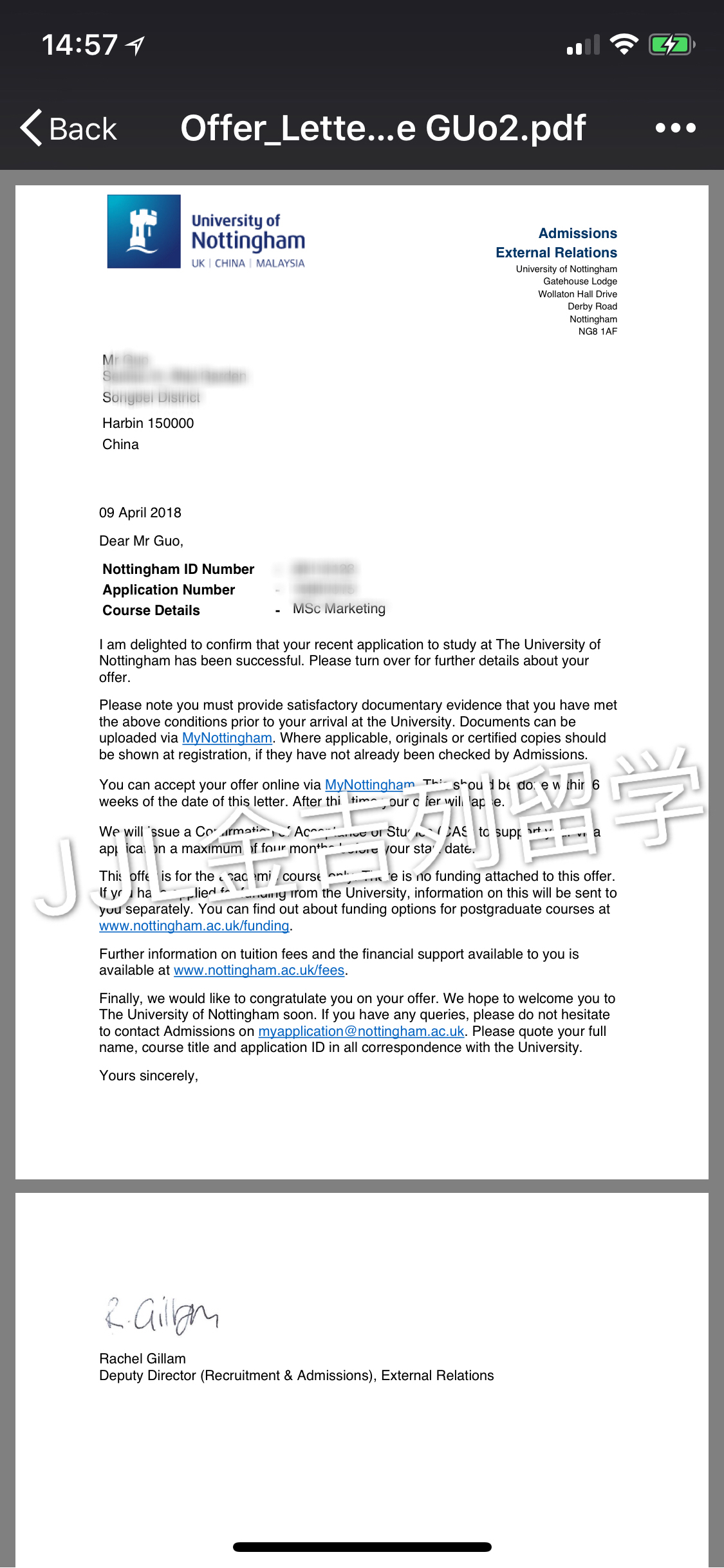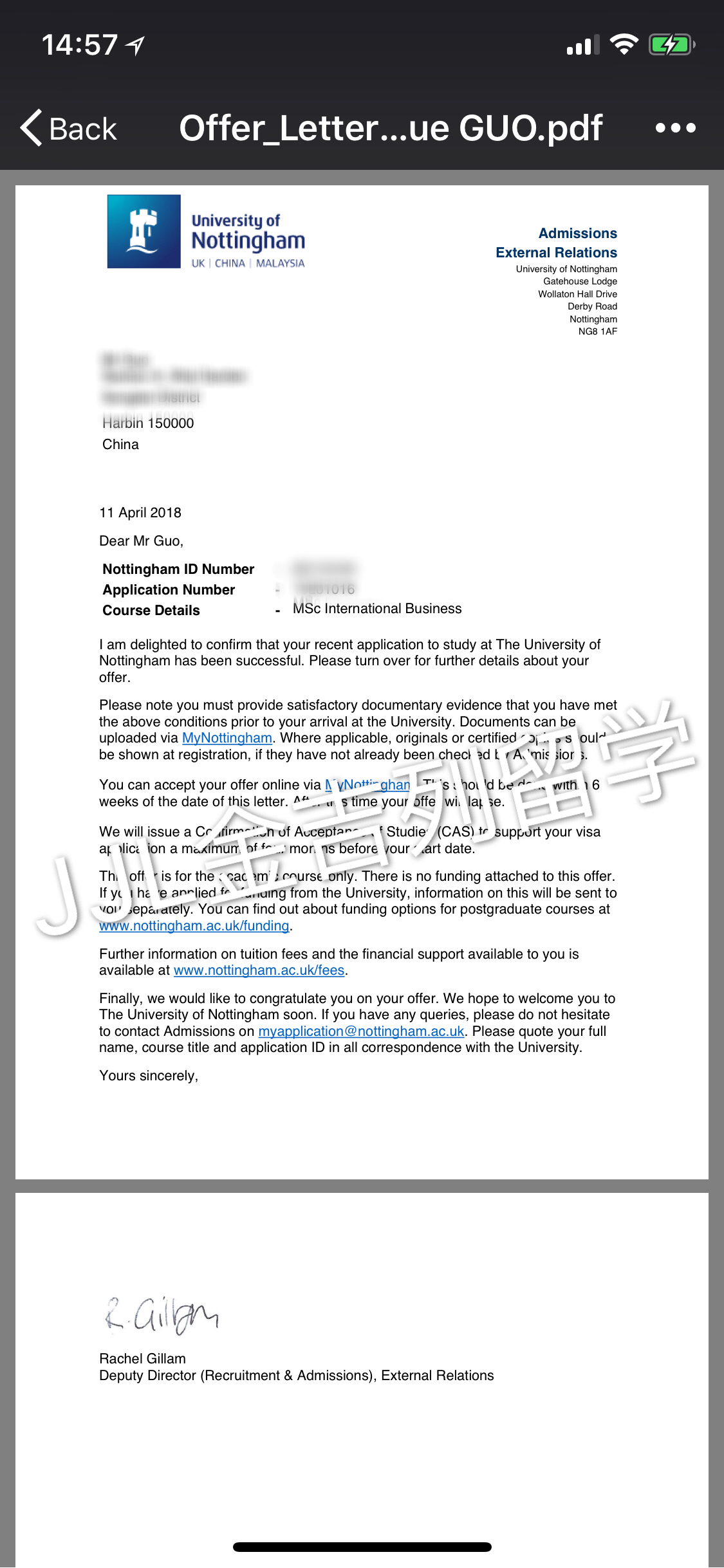郭同学开始办理留学的时候已经是三月末了,对于申请今年9月份入学的英国研究生来讲,申请时间已经是非常紧张,但是通过金吉列公司一套完整流畅的申请系统,顾问老师对于英国院校业务的熟练程度以及北京总部文案老师的专业文案功底,帮助郭同学在短短十几天就准备好所有需要递交申请的材料,及时在申请的收尾阶段接连成功地收获了全球百强名校,也是罗素大学集团成员之一的诺丁汉大学商科的两个专业的录取Offer。