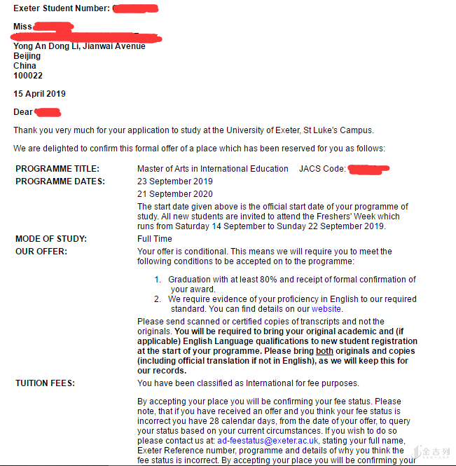 最终在申请递交的第15天,成功获得了埃克塞特大学的国际教育专业录取!