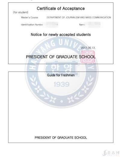 经过 5 个月的材料准备和学生在韩国的配合, 6 月份得到了汉阳大学大众传媒专业的录取通知书。