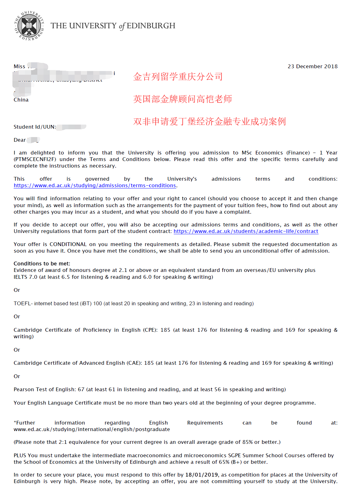 录取结果: 爱丁堡大学,University of Einburgh - MSc Economics (Finance)