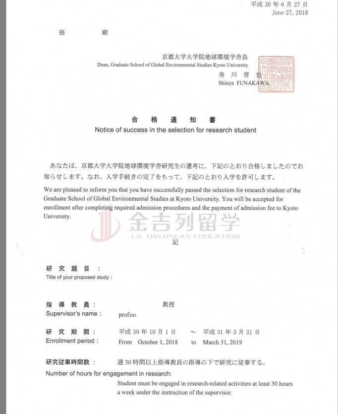 申请方面:学生前期准备充分,非常配合,短时间内准备好了成绩单、自我介绍等材料并开始申请。 最重要的申请环节其实是和教授的套磁环节,也是难度最大的环节。 由于时间申请比较紧张,加快了套磁频率,同时通过海外部门最大程度和教授沟通。得到京大、东外、筑波等院校教授的回复后,尽快进行了计划书写作。经过文案老师的指导和学生的不断努力,最终获得了教授内诺后拿到录取!
