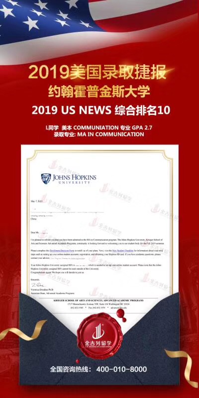 恭喜L同学拿到US NEWS综合排名第10的约翰霍普金斯大学的offer!