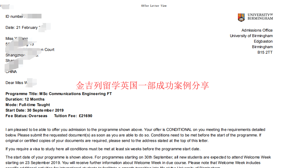 录取结果:University of Birmingham伯明翰大学(世界大学排名79名)