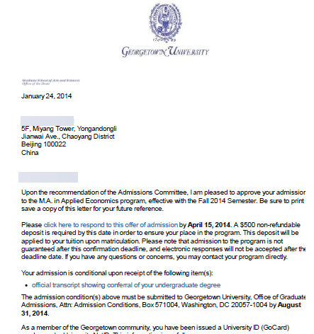 恭喜L同学被全美排名22名的乔治城大学录取。