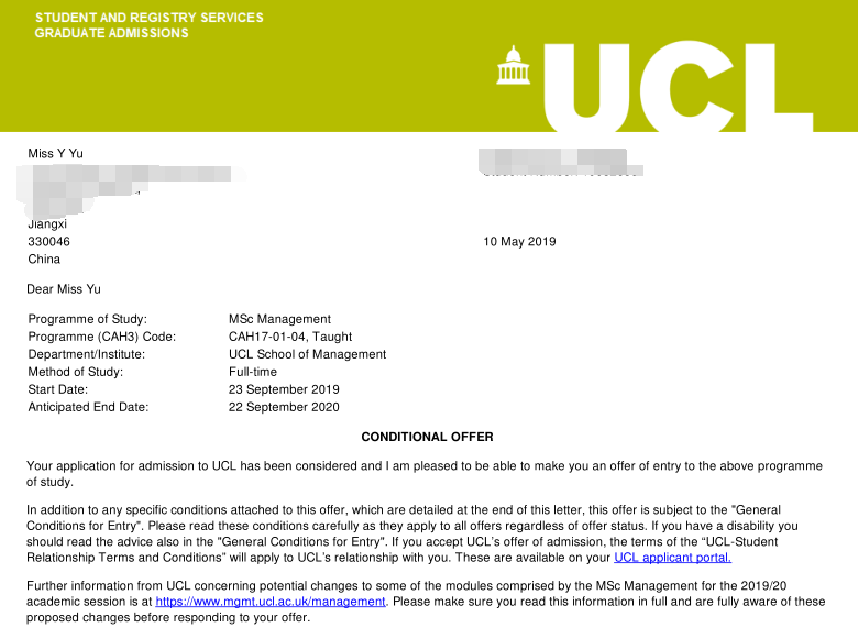 1, 学生背景:澳门科技大学,法律专业, 3.5 绩点,申请雅思 6.5 ,无 GAMT 成绩,有一段实习经历,转专业申请商科,最后成功录取伦敦大学学院等学校