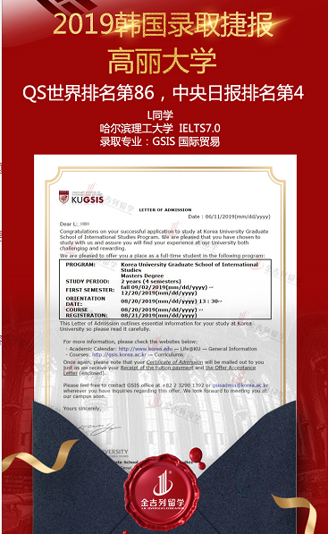 恭喜:L同学 雅思7.0,高丽大学 GSIS 国际贸易专业录取!!!