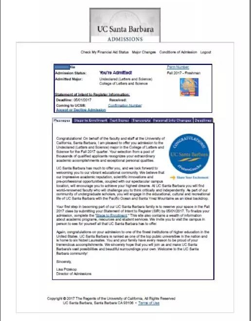 申请过程中, 在 UC系统开启的第一天, 在我的辅助之下, 便顺利地完成了网申工作 。 经过 了短暂的等待后, 终于 收到了多所大学的 Offer ! 最后决定选择加州大学圣巴巴贝拉分校。