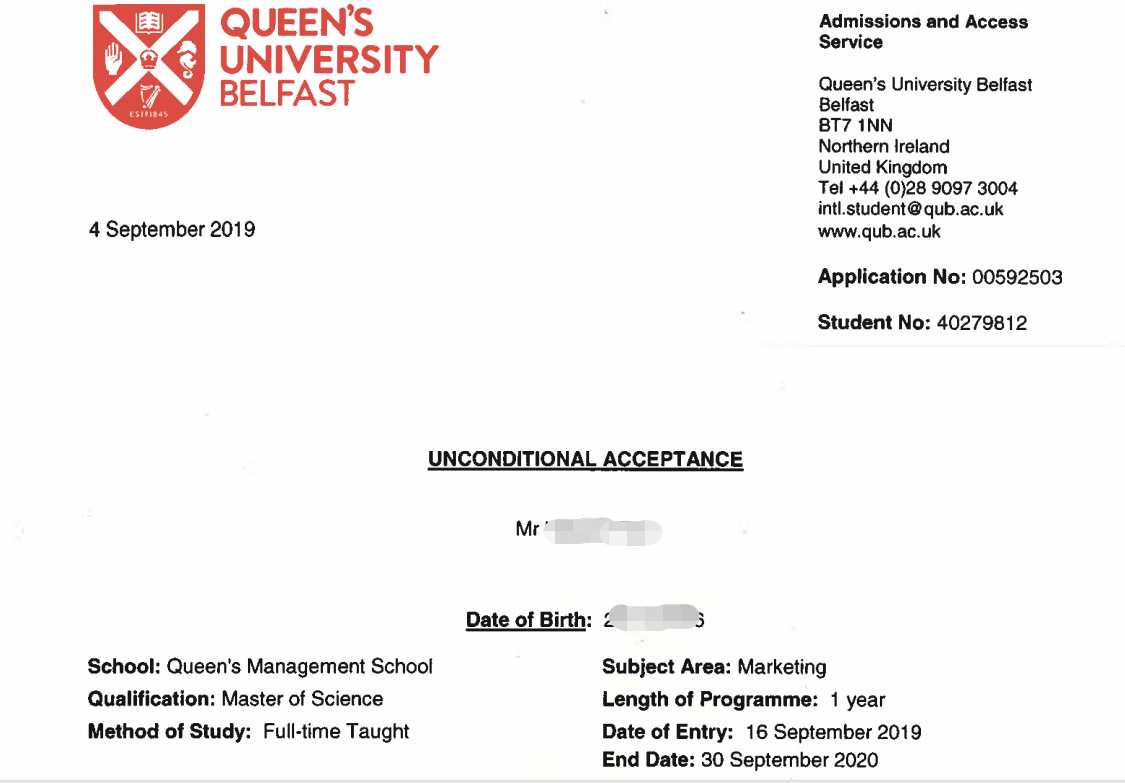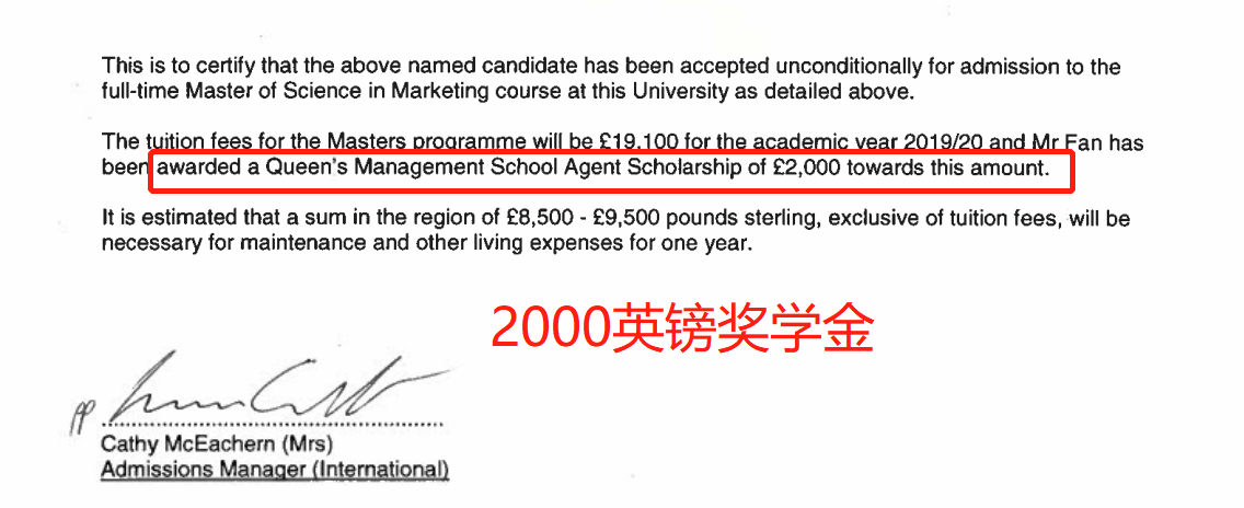 4、 其中学生最心仪的QS排名TOP 200,英国罗素集团大学给出的有条件录取为本科达到最终分数80分,学生大四只剩下毕业论文和实习两门可以拉分,但是把最终均分拉到80几乎是不可能的事情,但是我们没有放弃帮学生争取最心仪学校的硕士offer,待学生6月拿到完整成绩单毕业证学位证,文案团队马上操作argue信,进一步阐述学生的优势,以及进入英国女王大学的强烈愿望,最后已本科77.75分数,成功换取80分无条件录取,还额外获得2000英镑奖学金。