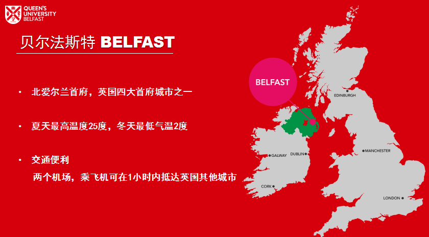 英国女王大学(Queen's University Belfast)于1845年维多利亚时代建校,是英国著名的常青藤名校罗素集团大学成员之一,位于英国北爱尔兰首府贝尔法斯特,其教研历史悠久,学术成就昭著,是英国历史最悠久的十所大学之一,,在学术研究和教育方面属于世界领先地位。空中交通方便,每天有35趟航班来往于伦敦空中飞行时间只需一小时。建筑古色古香,环境宜人。经过多年的发展,贝尔法斯特女王大学高水平的教学和科研已在国际上享有声誉。