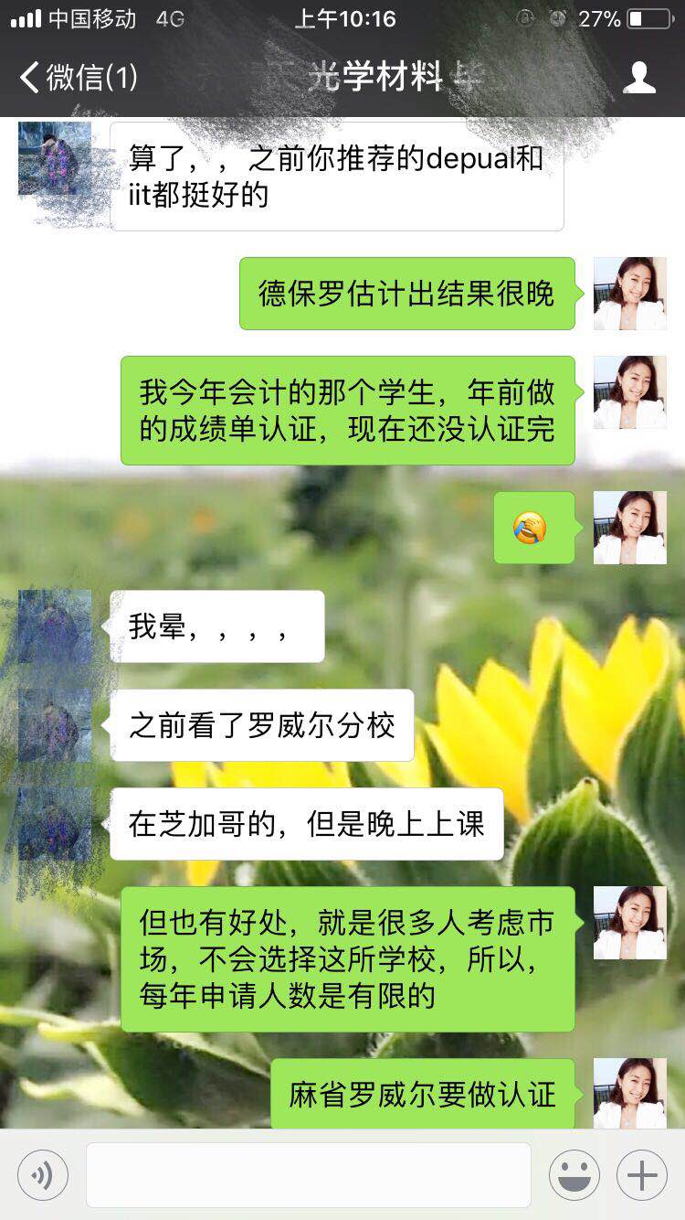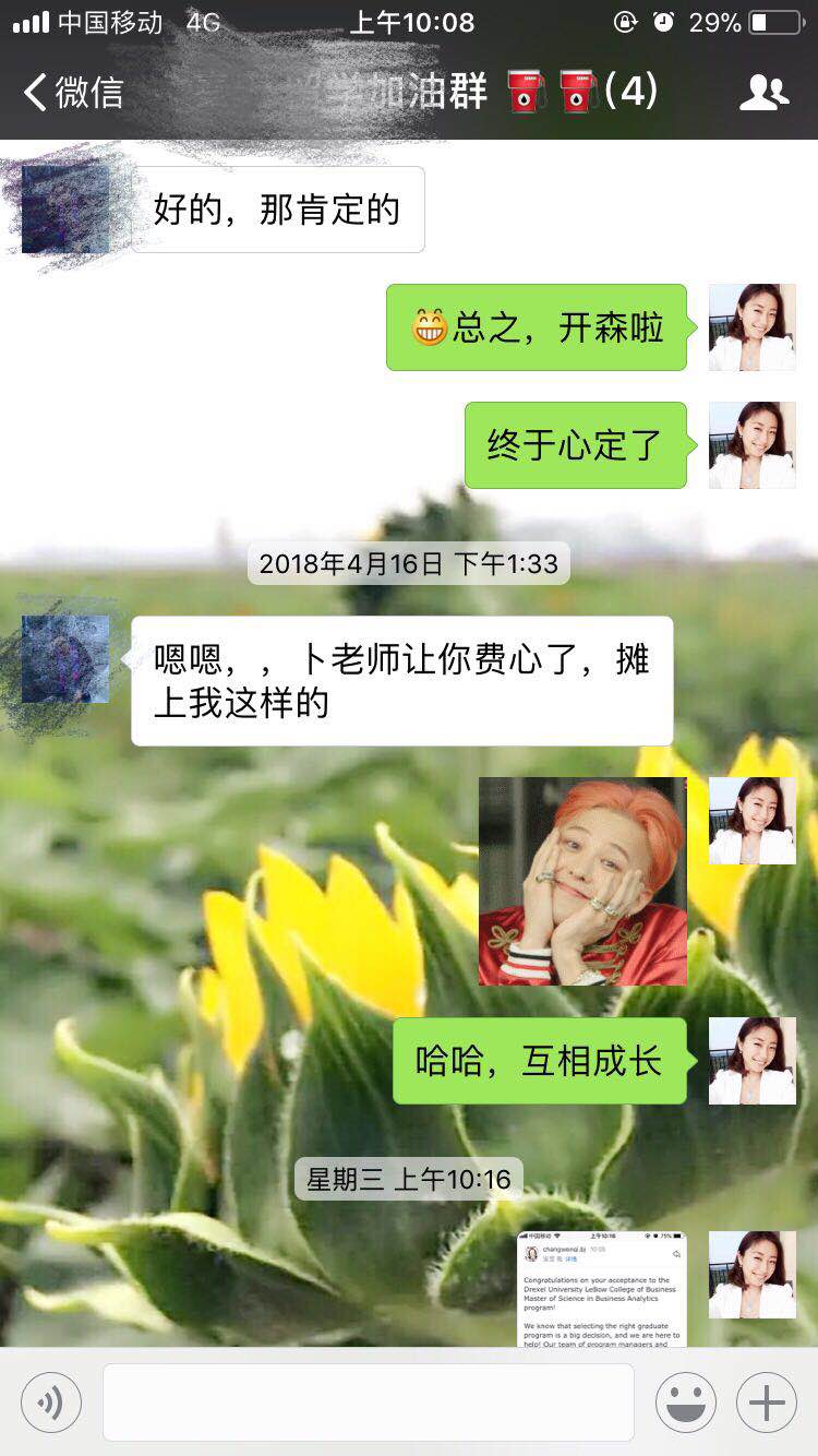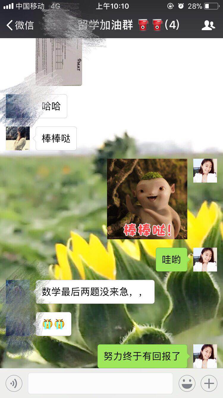 背景是客观存在,无法改变的。我们能够做的就是通过标化成绩,证明自己的学习能力。因为离开学校已经很久,加上理工科学生,英语本身就属于自己弱项。在此过程中,GMAT一直在540徘徊,托福70分上下,我们不断鼓励其出分,树立信心,每次进步一点点。(因为GPA没有上到2.5,如果GMAT还没有上到600,T没有上到90,真的很难选校及申请到有所谓US NEWS排名的学校)