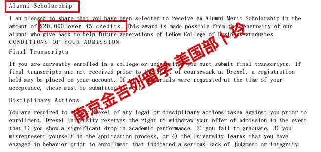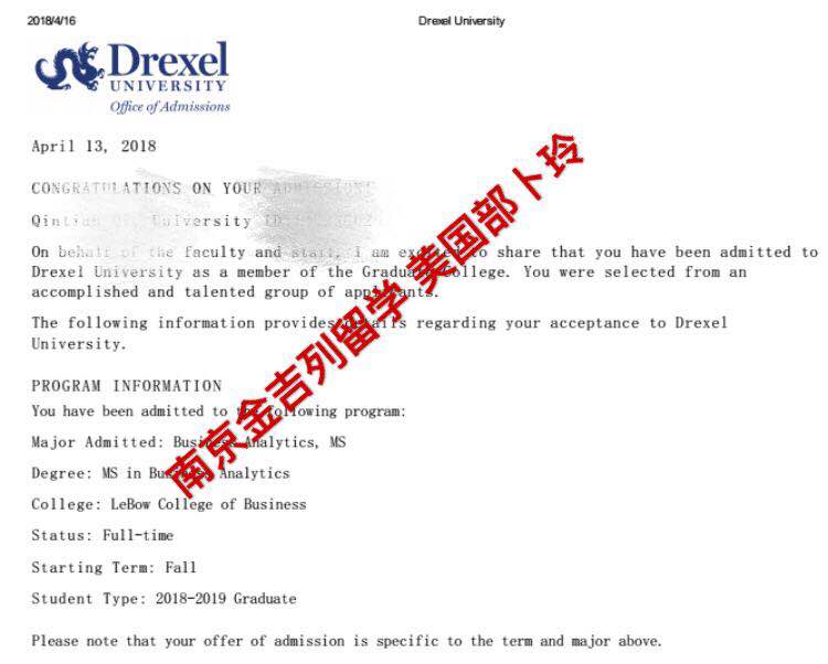 德雷赛尔大学 商业分析录取信 & $20000校友奖学金