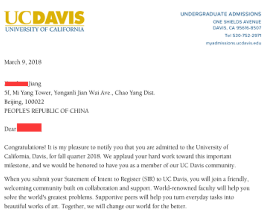 加州大学河滨分校录取并给与每年13500美金奖学金