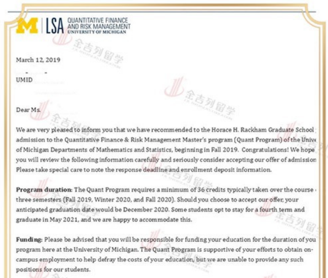 恭喜Z同学获得密歇根大学安娜堡分校数理金融的录取offer一枚!