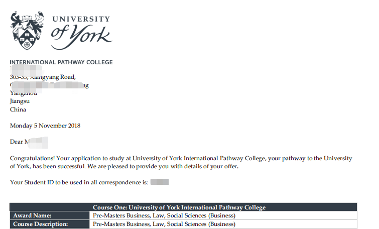 学生专科所学专业是工商管理,硕士也还是想申请热门商科。商科无论在哪个国家都是热门的专业,更别说主流留学国家英国了。以学生的背景和语言成绩想上英国商科,排名还相对靠前的院校的话,建议是走预科,后衔接正科。好在学生也比较赞同,家长也都支持,于是我第一时间帮学生准备材料做申请,很快KAPLAN 约克预科OFFER也下来了。预科有1月份和9月份开学课程,学生最后选择走1月份,读完2学期预科,衔接同年9月硕士正科。