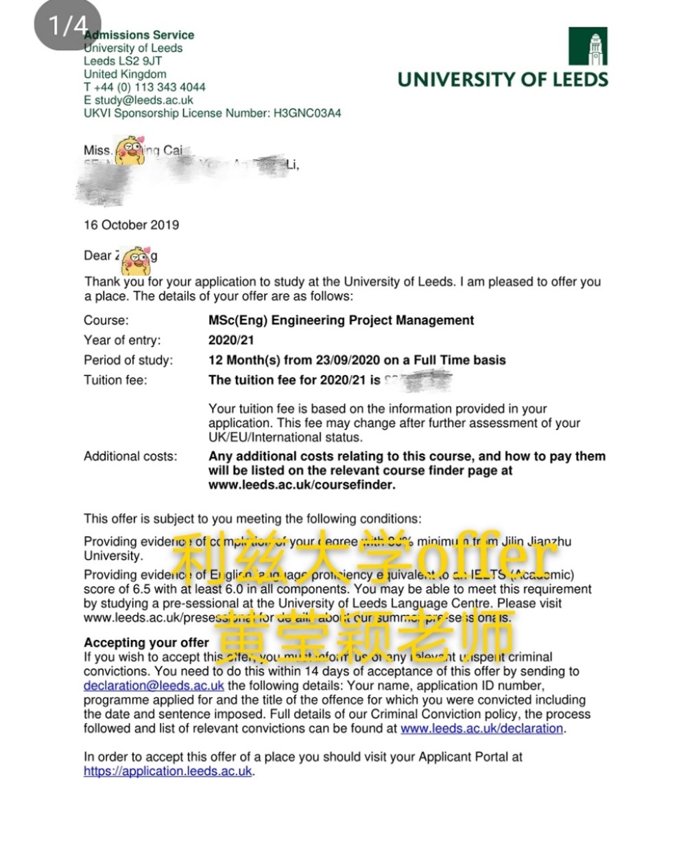 赶着学校开放就马上递交出申请,功夫不负有心人,四周后就拿到了梦寐以求的利兹大学录取。