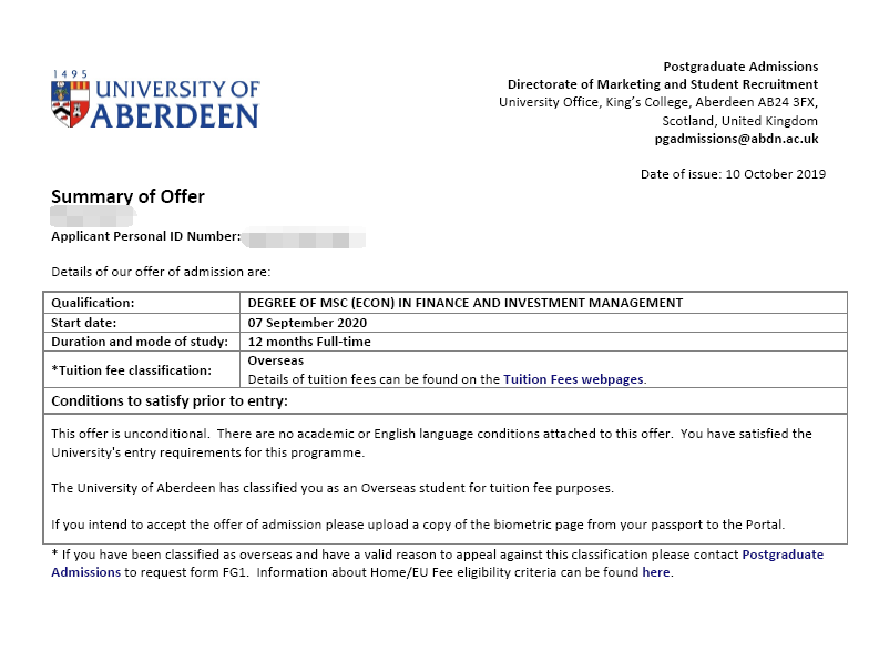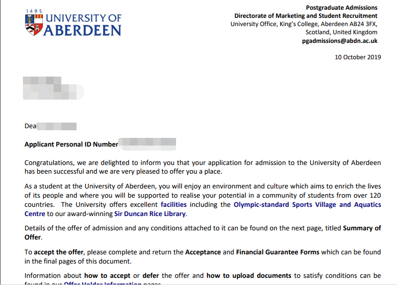 录取结果 :英国阿伯丁大学(世界排名172位)