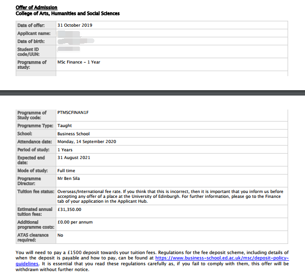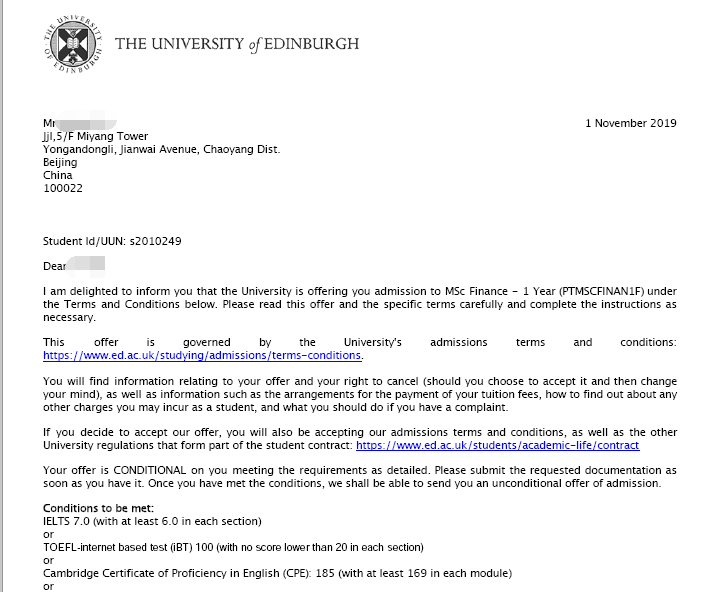 录取结果 :英国爱丁堡大学(QS世界排名18位)