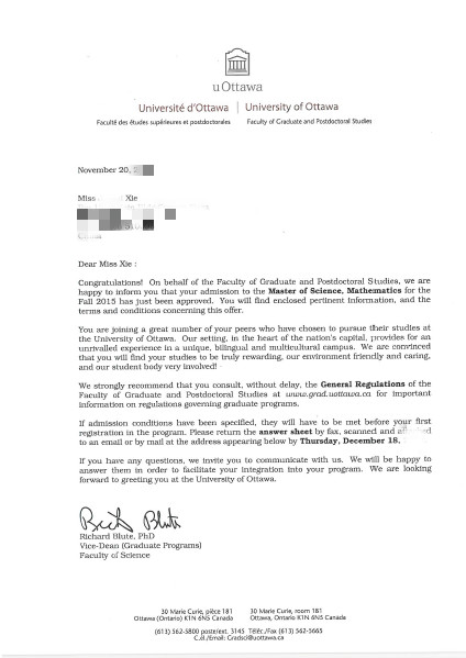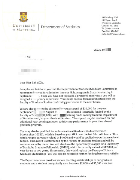 由于启动早,准备工作很有条理,在 10 月下旬就拿到了渥太华的 offer ,没多久也等来了曼尼托巴大学的录取通知。