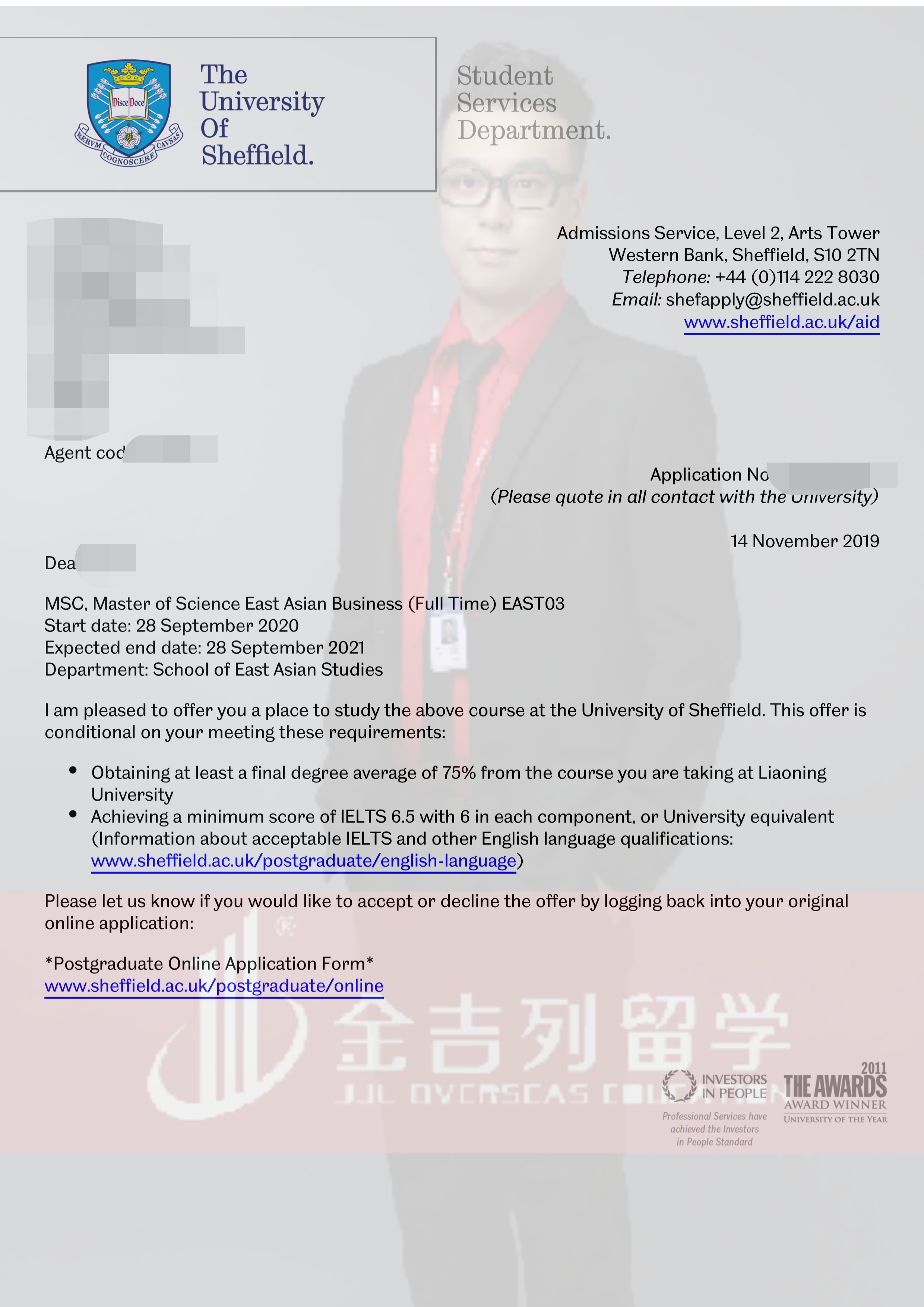车同学是辽宁大学外语学院英语专业的学生,均分将近80,英语专业转商科专业,申请谢菲尔德大学,成功的拿到了录取,学生是大三下开始准备材料,申请两个方向(教育&商科),在文书中着重的体现了转专业的原因,以及学生的在校经历,在学生会的经验,成功的拿到了谢菲尔德大学的录取以及格拉斯哥大学的录取,也期望学生能拿到更多理想的通知书~以下是谢菲尔德通知书展示
