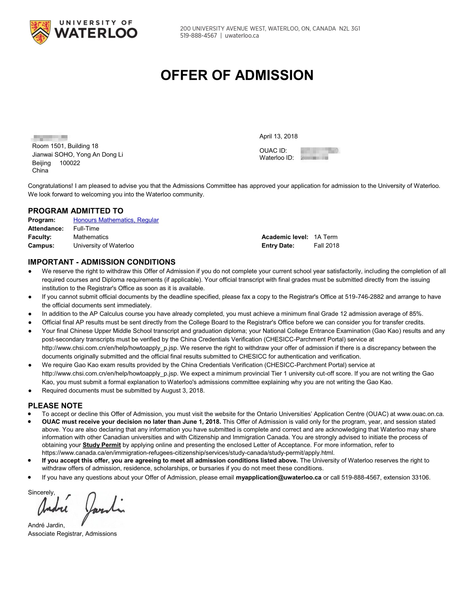 2,学生同时以雅思5,5的成绩申请了西安大略大学、滑铁卢大学、达文豪斯大学、渥太华大学等,最开始只有达文豪斯大学来了录取offer。后期建议学生再考试一次雅思,最后递交了雅思6分的成绩,最终收到了多所学校录取通知书,最后选择了自己喜欢的滑铁卢大学数学专业。