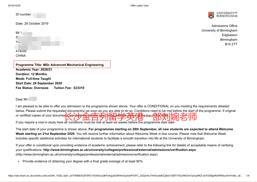 学生申请时间早,申请材料齐全,伯明翰大学刚开放申请,就递交出了申请,所以发放录取的时间,包括审理周期也相对较早。